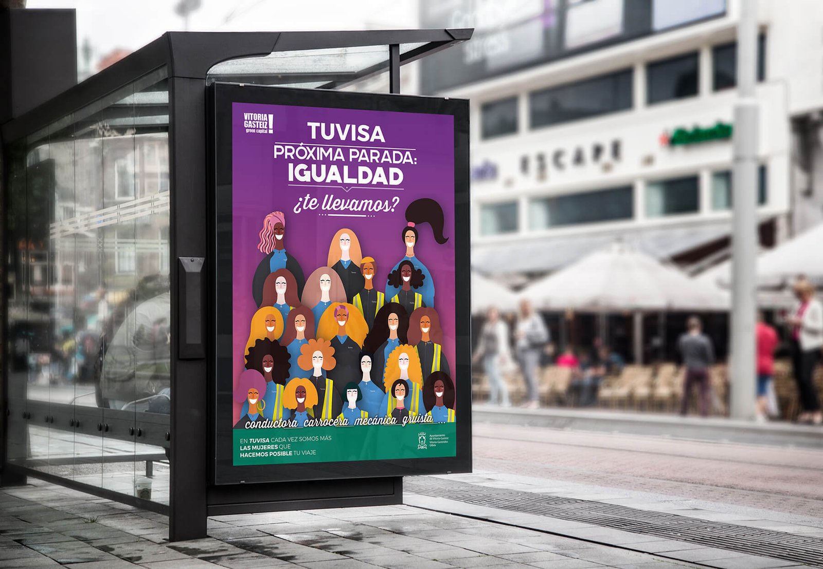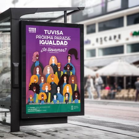 El eslogan de la campaña hace alusión a ese paso adelante que se quiere dar en TUVISA para ampliar el número de mujeres trabajadoras en el sector, jugando con la frase “PRÓXIMA PARADA” que todos conocemos y asociamos al autobús urbano, con el objetivo de visibilizar y reivindicar la “IGUALDAD”. Por otro lado, el subtitular “¿TE LLEVAMOS?” involucra directamente a TUVISA, convirtiendo a la empresa en la conductora de esta campaña para conseguir que más mujeres se incorporen en todos los sectores a su plantilla. Finalmente, para remarcarlo y dar un mensaje lo más explícito posible, añadimos la frase “En TUVISA cada vez somos más las mujeres que hacemos posible tu viaje”, que resume en pocas palabras el sentir y horizonte al que se dirige la empresa.