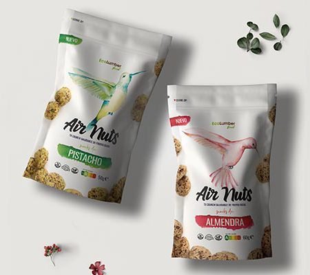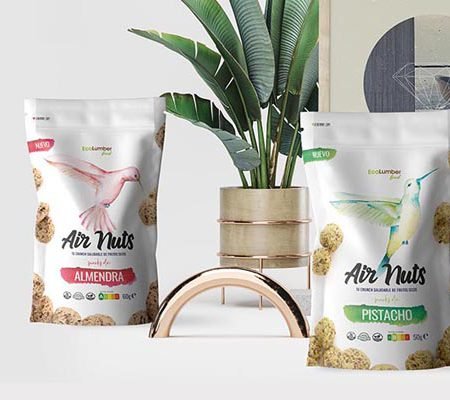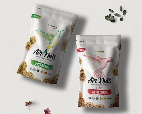 Diseño del packaging y punto de venta para la marca de snacks de frutos secos Airnuts. Un producto ligero, sano y saludable. Con estas premisas buscamos un referente natural que tuviese esas características.