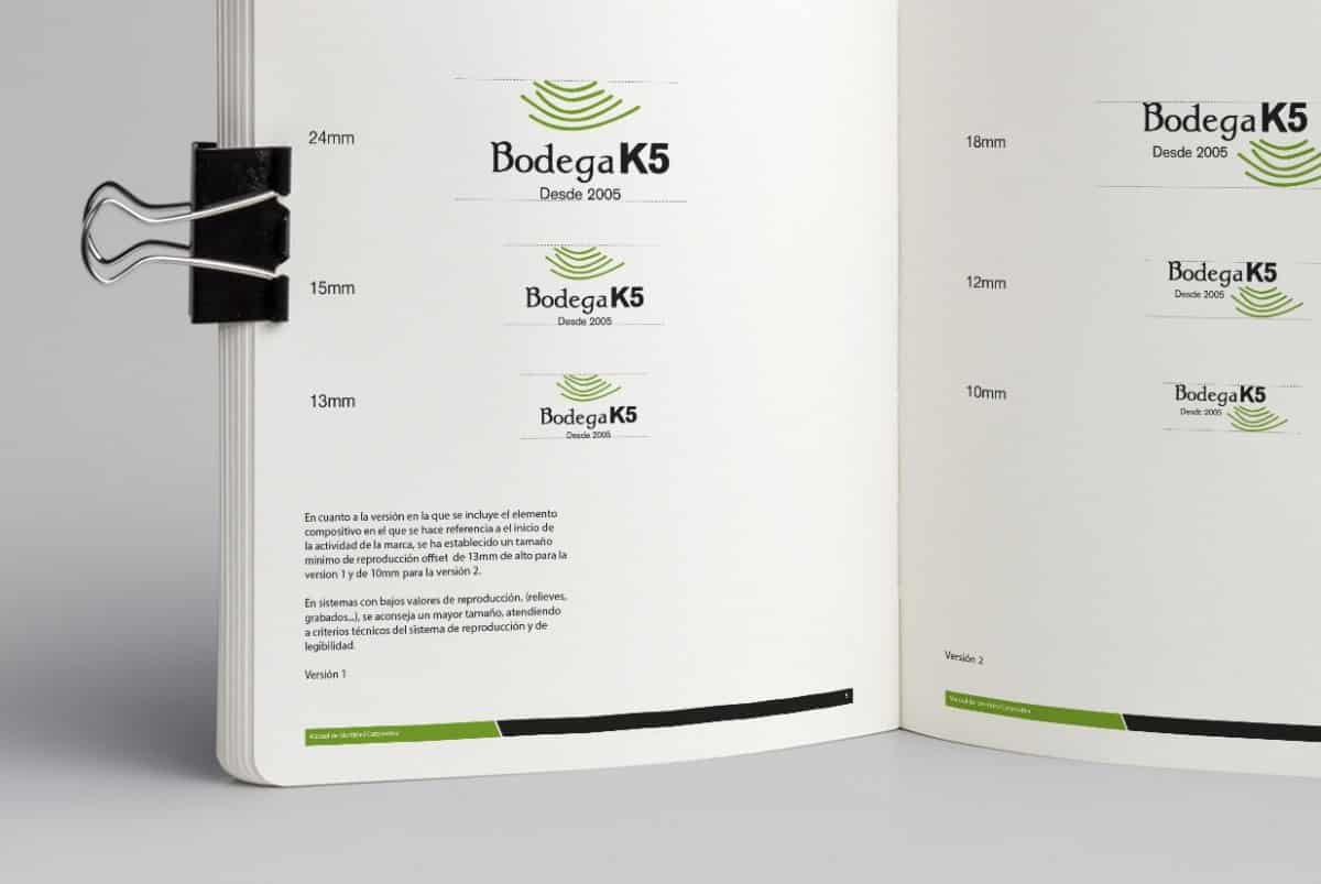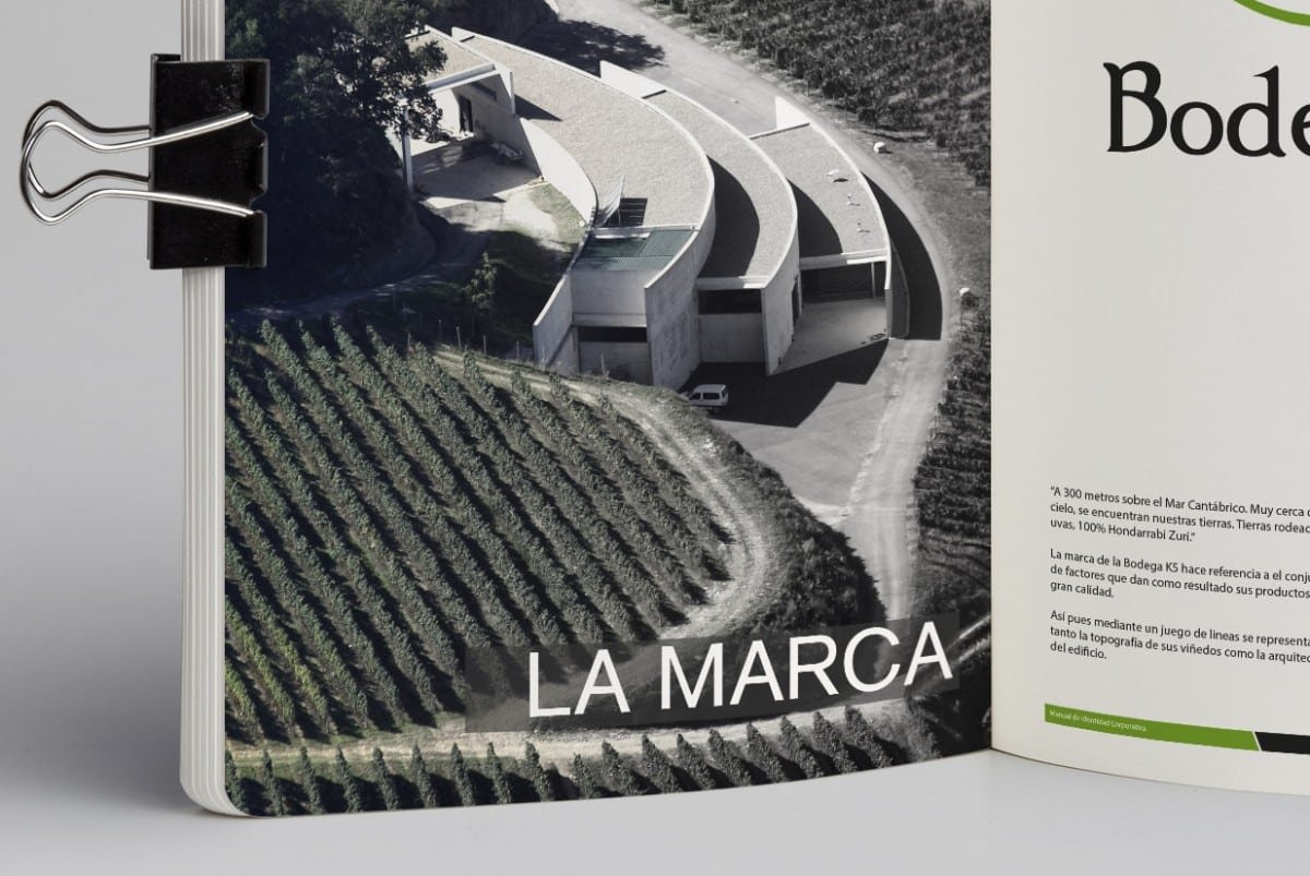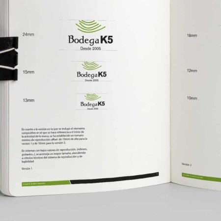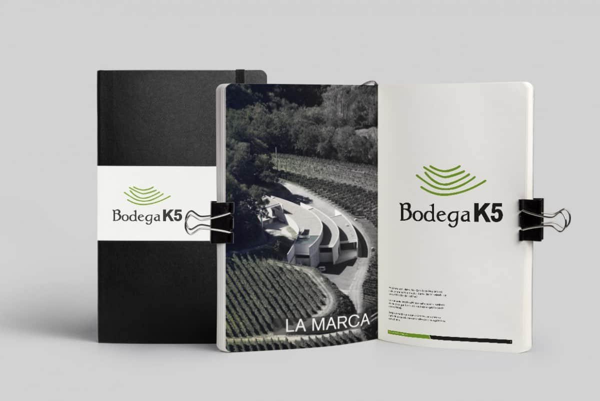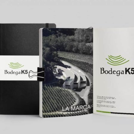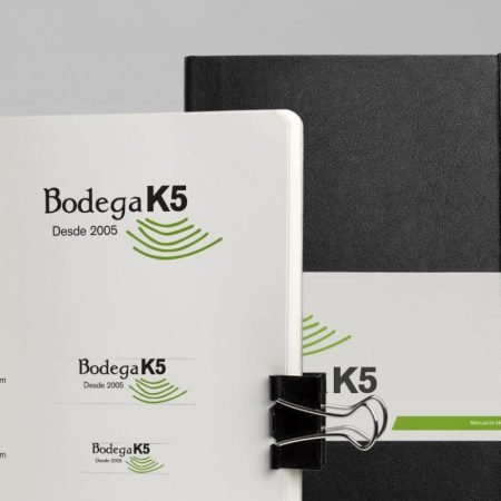 La realización de este logotipo debía reflejar la imagen de la bodega. ¿Cómo hacerlo y transmitir esa identidad? Partimos del elemento fundamental del vino, la uva y a partir de ahí de ese elemento individual fuimos a uno global que nos particularizara. Vino, uva, viña, terrazas, bodega y este último elemento nos dio la clave. La bodega simula desde el aire la forma de terrazas para cultivar las viñas dándonos un elemento diferenciador. Estas terrazas se encuentran alrededor de la bodega, de cara al mar y hacen de estos vinos algo especial. Por lo tanto, una vez encontrado el elemento, lo plasmamos de una forma simbólica. El color venía marcado por las viñas en pleno esplendor. Las tipografías tienen la convergencia de una tradicional y otra robusta y moderna, símbolos de lo que pretende ser la bodega K5